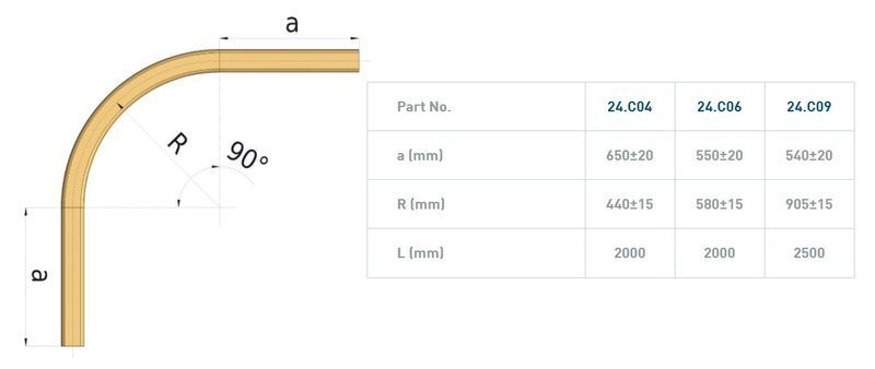 Łuk szyny nośnej 90° NIKO 24.C09, promień 905±15 mm, odcinki proste 540±20 mm, ocynk