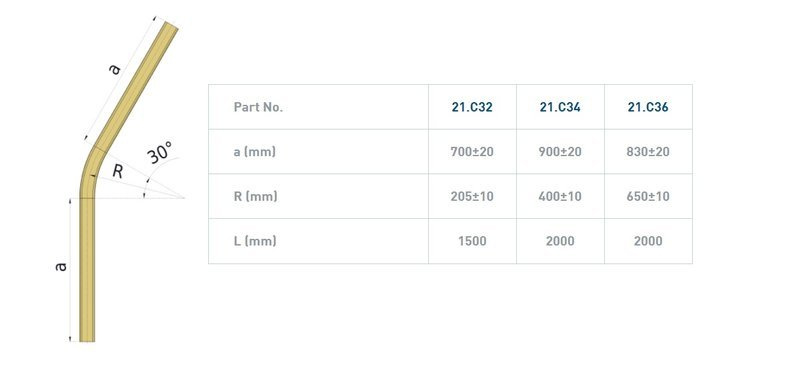 Łuk szyny nośnej 30° NIKO 71.C32, promień 205±10 mm, odcinki proste 700±20 mm, stal kwasoodporna AISI 316