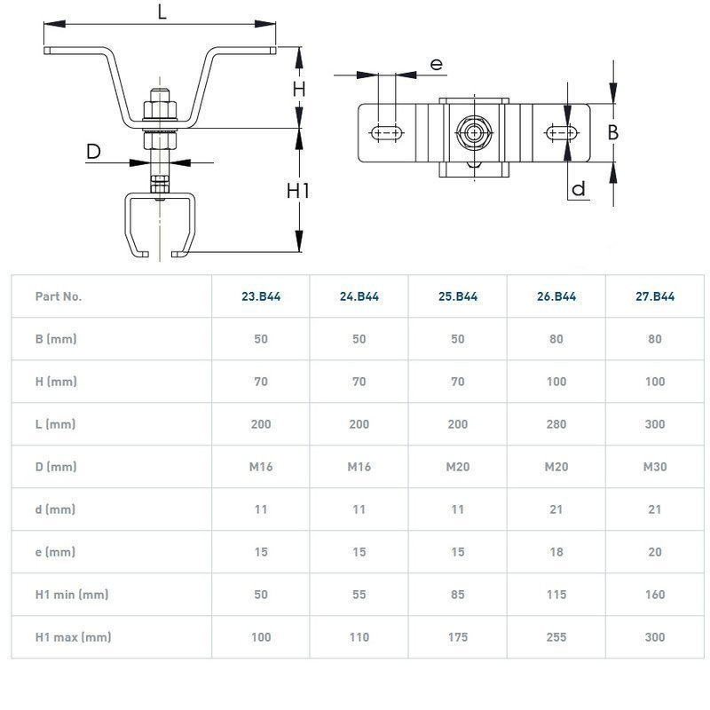 Ten regulowany uchwyt szyny z wspornikiem NIKO 55.B44 wykonany jest ze stali nierdzewnej AISI 304, co gwarantuje jego trwałość i odporność na korozję. Dzięki możliwości precyzyjnego regulowania wysokości zawieszenia, jest to idealne rozwiązanie do różnych zastosowań.