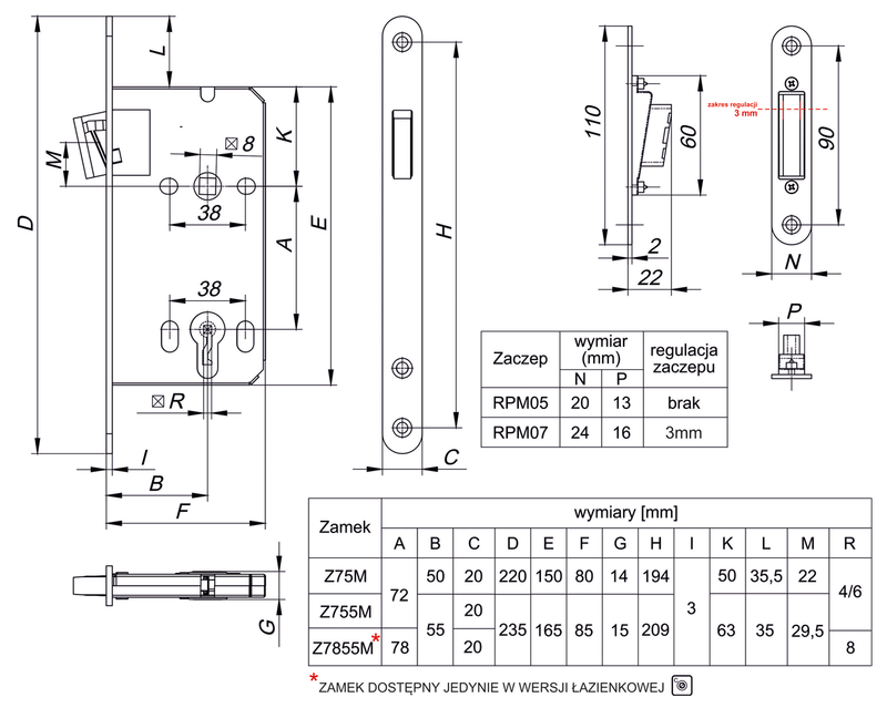 Zamek dostępny z zaczepem regulowanym i z zaczepem bez regulacji.