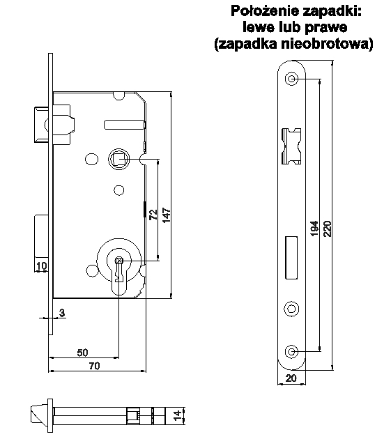 - Zamek wpuszczany 72/50 mm z zaczepem, puszka 70 mm