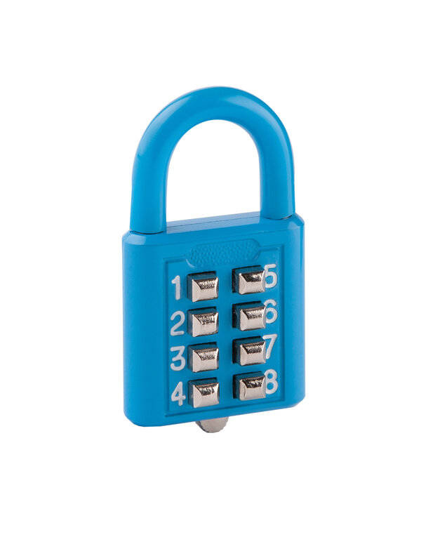 - Kłódka szyfrowa, zatrzaskowa 8-cyfrowa.