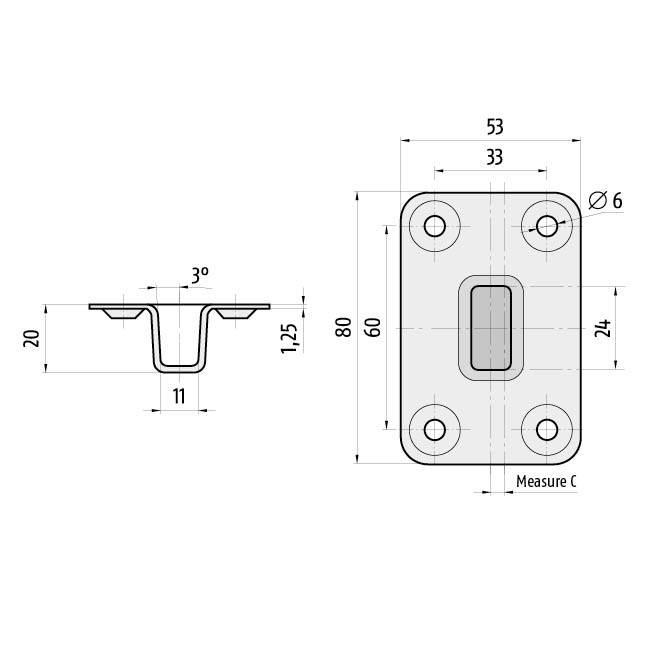- Dolne, szerokie gniazdo do zasuwy drzwiowej typ "0" (otwór centralnie) / typ "2" / typ "4" (otwory nieosiowo).
