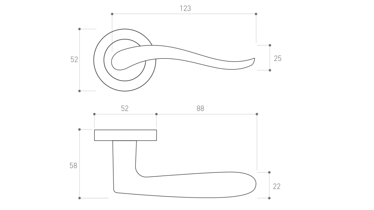 Zawartość: 2 klamki (lewa+prawa); podkładki montażowe; śruby przelotowe; trzpień 8 mm (do drzwi 30-60 mm).