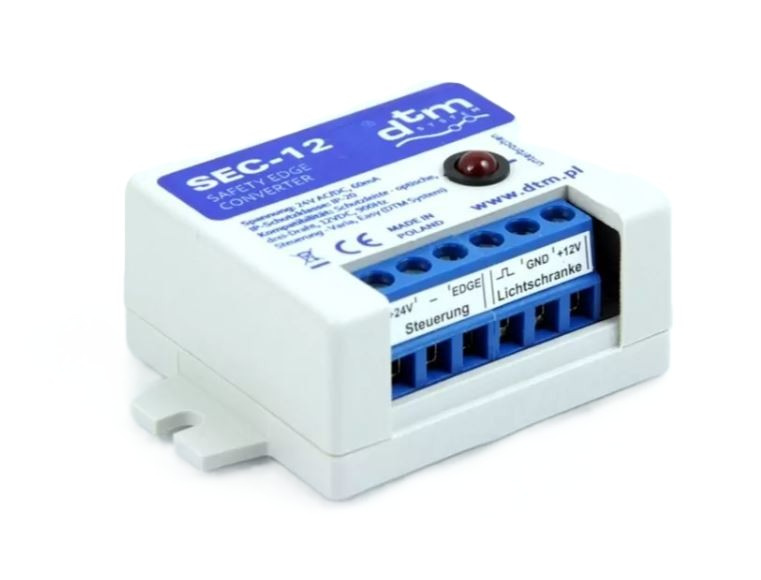SEC-12 to konwerter sygnału cyfrowego z optycznej listwy zabezpieczającej na standard NC. Urządzenie przeznaczone jest do sterowników bram nie posiadających wejścia cyfrowego dla urządzeń bezpieczeństwa. Sygnał wyjściowy z konwertera (wyjście typu OC) należy podłączyć do wejścia przeznaczonego dla standardowych urządzeń zabezpieczających NC, gdzie alarm z czujnika powoduje rozwarcie sygnału w obwodzie zabezpieczającym od masy sygnałowej (0V).