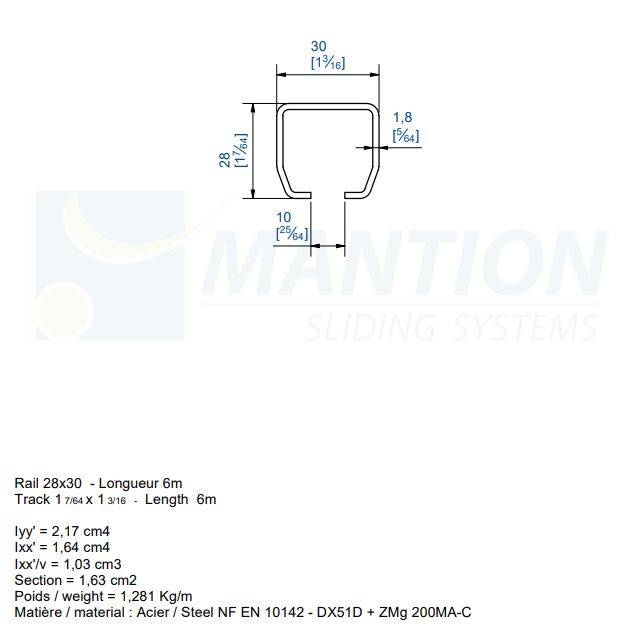 Szyna nośna systemu HERCULE 9010, mogąca pracować z obciążeniem do 90 kg na metr bieżący toru. Szyna o wymiarach 28 x 30 mm w ocynku, który gwarantuje wysoką odporność na warunki atmosferyczne.