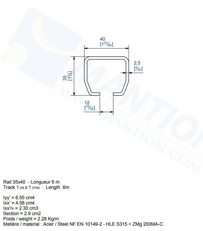 Szyna nośna systemu MANTION 9030 o nośności 180 kg na metr bieżący. Wymiary zewnętrzne szyny to 35x40 mm. Szyna w pełnym ocynku, zapewniającym wysoką odporność na warunki atmosferyczne.