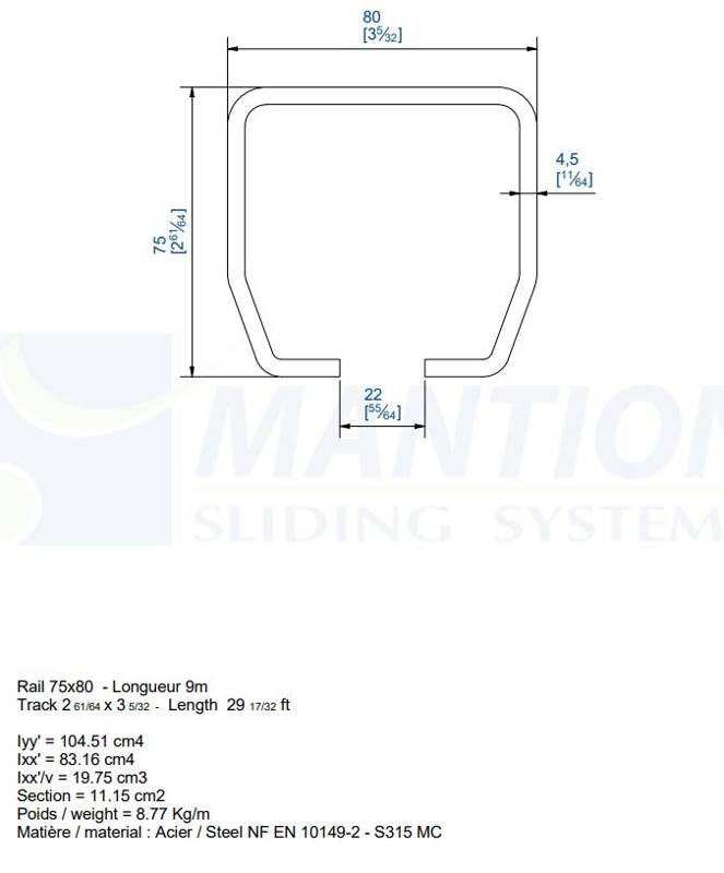 - Szyna nośna 75x80 mm, stal czarna (bez zabezpieczenia antykorozyjnego).