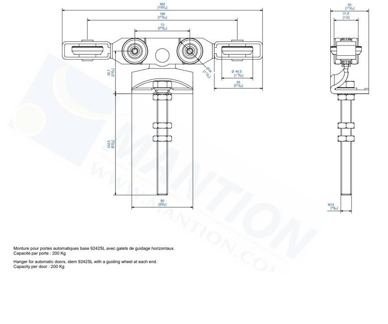 System podwieszany HERCULE 9040 składa się z solidnej konstrukcji, wózka 6-kołowego z przedłużonym trzpieniem do drzwi automatycznych MANTION 9242SEL, ocynk, oraz specjalnie zaprojektowanych kół, które zapewniają płynne i stabilne poruszanie się ładunków o wadze do 200 kg. Dzięki wysokiej jakości materiałom i precyzyjnemu wykonaniu, system ten gwarantuje niezawodność i bezpieczeństwo podczas transportu.
