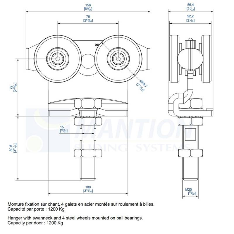 - Maksymalna waga skrzydła (2 wózki) 1200 kg.
