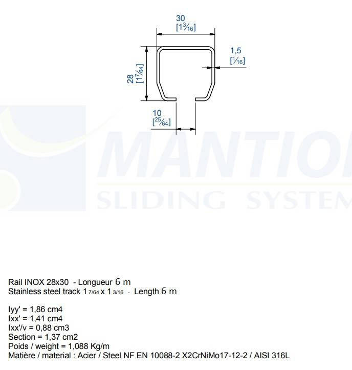 • Szyna nośna 28x30 mm, stal nierdzewna AISI 304.