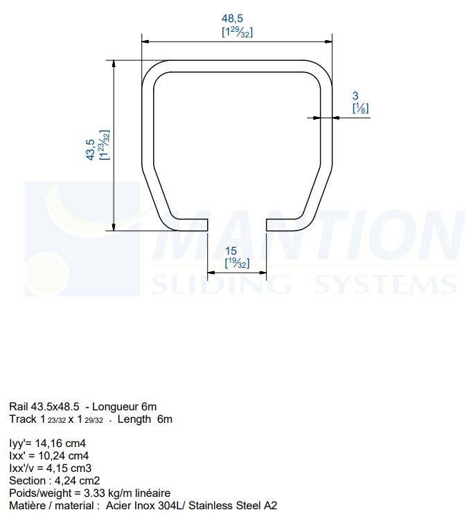 - Szyna nośna 43,5x48,5 mm, stal nierdzewna AISI 304.