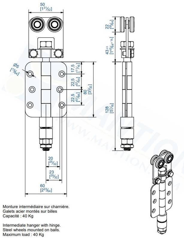 - Wózek pośredni do drzwi łamanych (narożnikowych) z zawiasem.