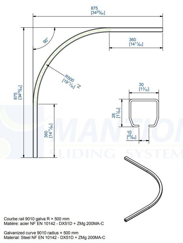 Łuk szyny nośnej 90° MANTION HERCULE 9010C, promień 500 mm, odcinki proste 360 mm, ocynk