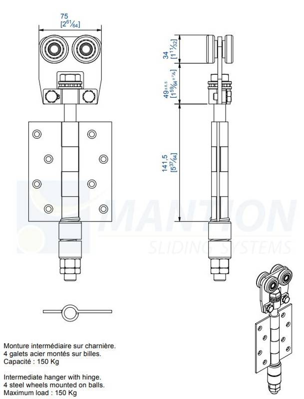 - Wózek pośredni do drzwi łamanych (narożnikowych) z zawiasem.