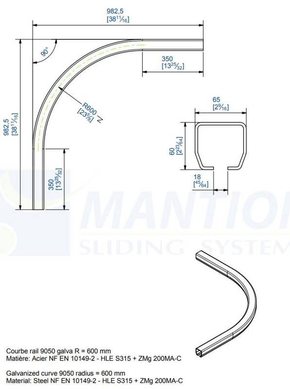 Łuk szyny nośnej 90° MANTION HERCULE 9050C, promień 600 mm, odcinki proste 350 mm, ocynk