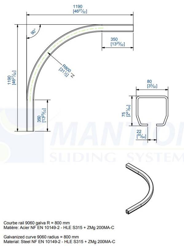 Łuk szyny nośnej 90° MANTION HERCULE 9060C, promień 800 mm, odcinki proste 350 mm, ocynk