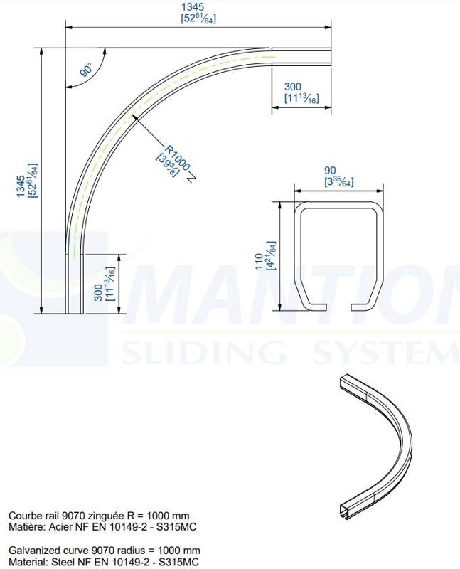 Łuk szyny nośnej 90° MANTION HERCULE 9070C, promień 1000 mm, odcinki proste 300 mm, ocynk