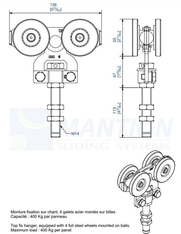 - Maksymalna waga skrzydła (2 wózki) 400 kg.