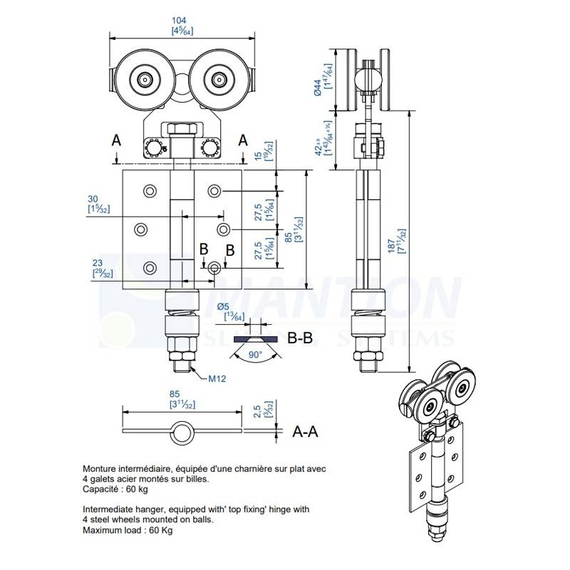 Wózek 4-kołowy z zawiasem MANTION 0352, ocynk to doskonałe rozwiązanie do systemów podwieszanych i bram przemysłowych. Dzięki swojej konstrukcji jest w stanie udźwignąć do 60 kg, co czyni go idealnym do użytku w różnorodnych zastosowaniach przemysłowych.