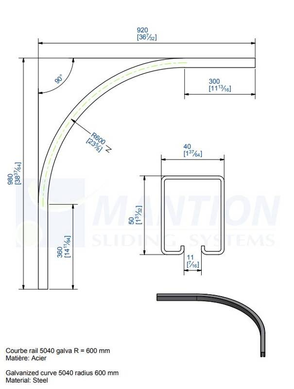 Łuk szyny nośnej 90° MANTION SPORTUB 5040C, promień 600 mm, odcinki proste 300 + 360 mm, ocynk