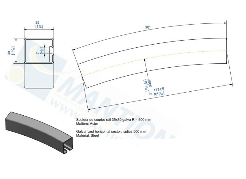 Sektor łuku szyny nośnej MANTION SPORTUB 3530CS, promień 500 mm, kąt 20°, 173 mm, ocynk