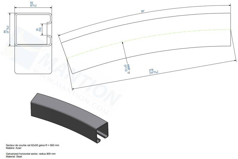 Sektor łuku szyny nośnej MANTION SPORTUB 6255CS, promień 800 mm, kąt 20°, 278 mm, ocynk. Zdjęcie przedstawia wysoką jakość wykonania i trwałość produktu.