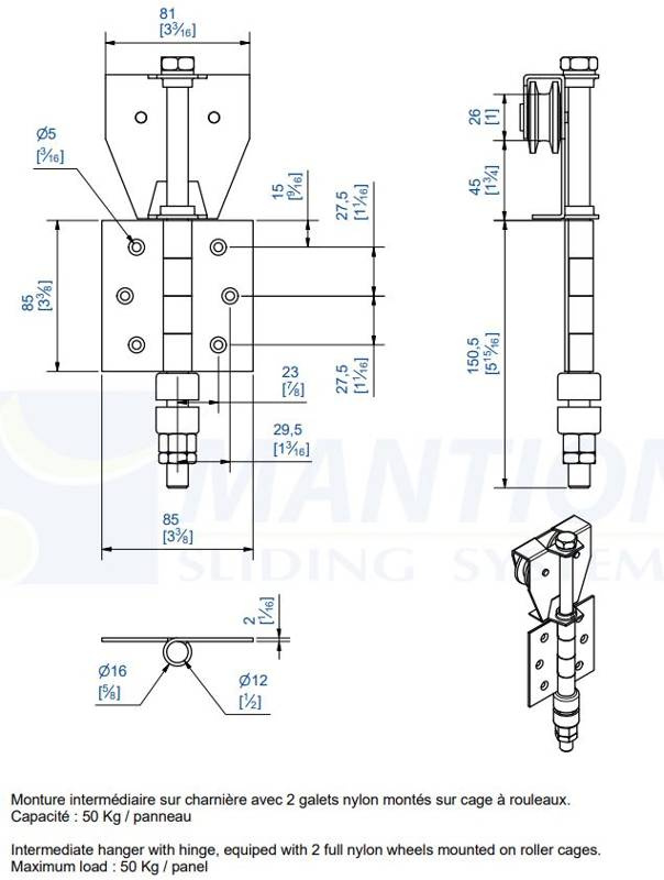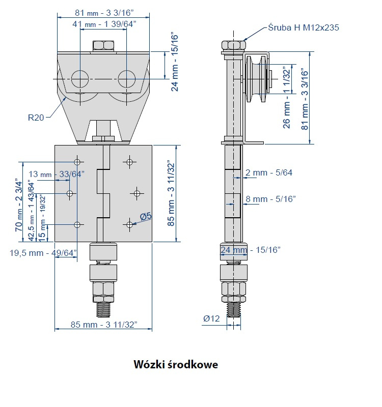 • Pośredni wózek przeznaczony do pracy w szynach MANTION BOB50 - płaskownik 40x6 mm