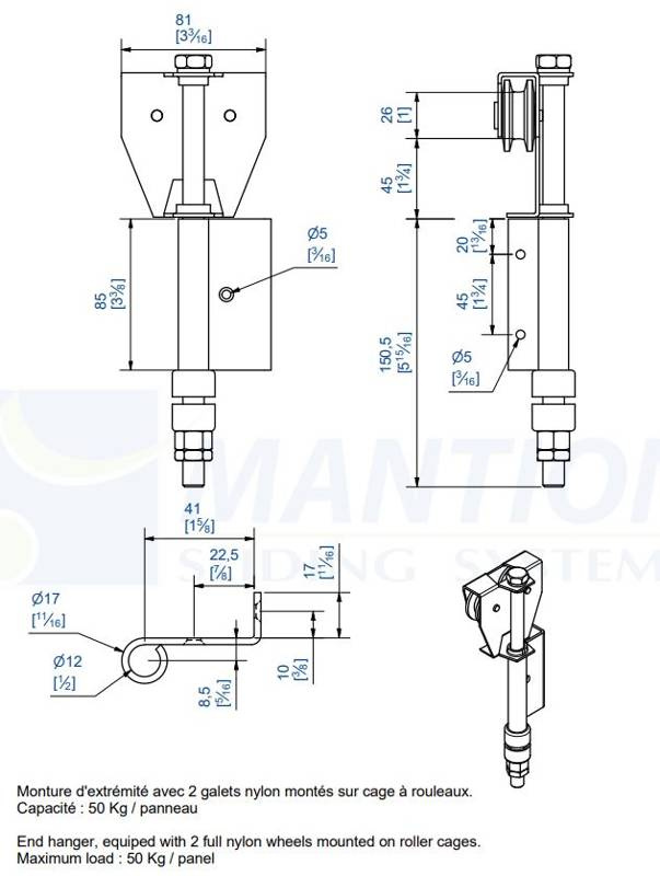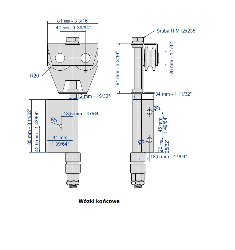 - Końcowy wózek przeznaczony do pracy w szynach MANTION BOB50 - płaskownik 40x6 mm