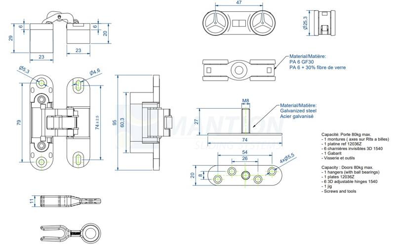 • Zawiera: 1x wózek (łożyskowany); 1x uchwyt montażowy wózka 12036Z; 6x zawias 1540; elementy montażowe; instrukcję