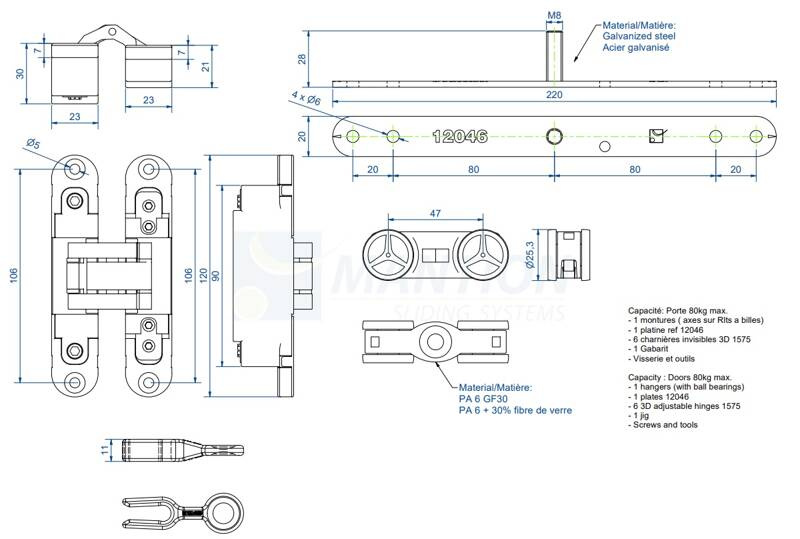 - Zawiera: 1x wózek 13232 (łożyskowany); 1x wzmocniony uchwyt montażowy wózka 12046; 6x wzmocniony zawias 1575; elementy montażowe; instrukcję