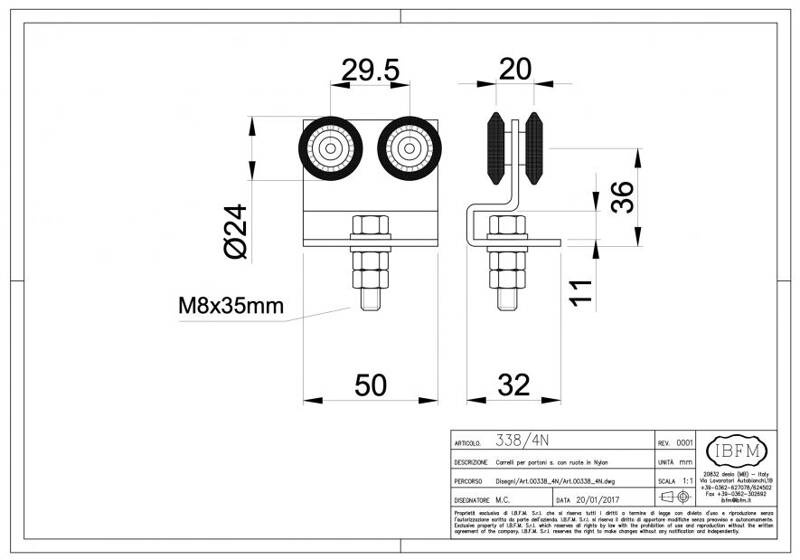 Wózek 4-kołowy gięty IBFM do szyny nośnej 33x34 mm, typ 338/4N z trzpieniem gwintowanym M8, koła nylonowe
