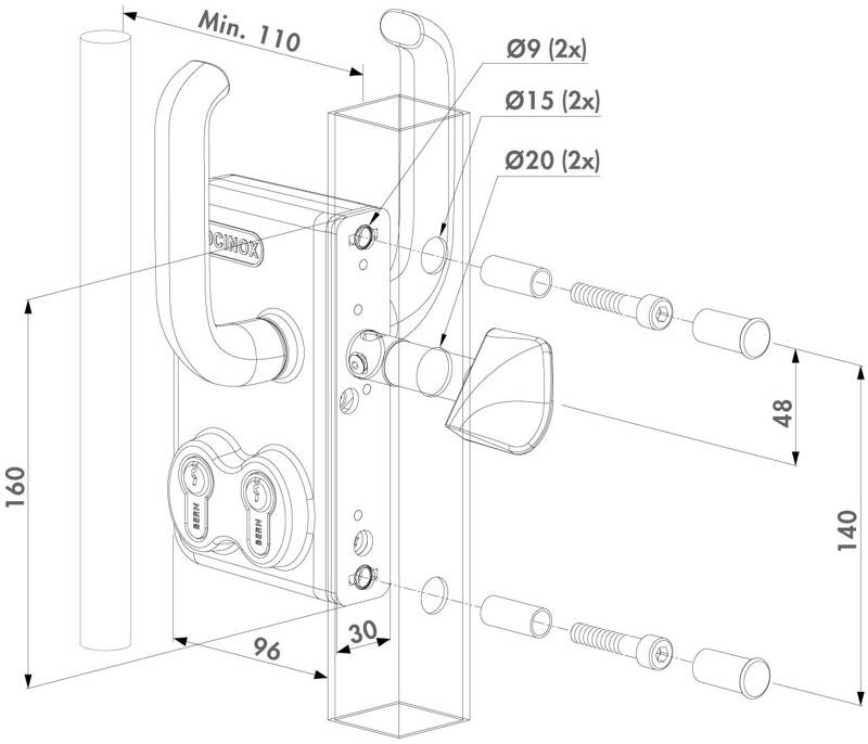 Zamek z dwiema wkładkami do bram przesuwnych Locinox LGKZ D1 na profil kwadratowy 100 mm