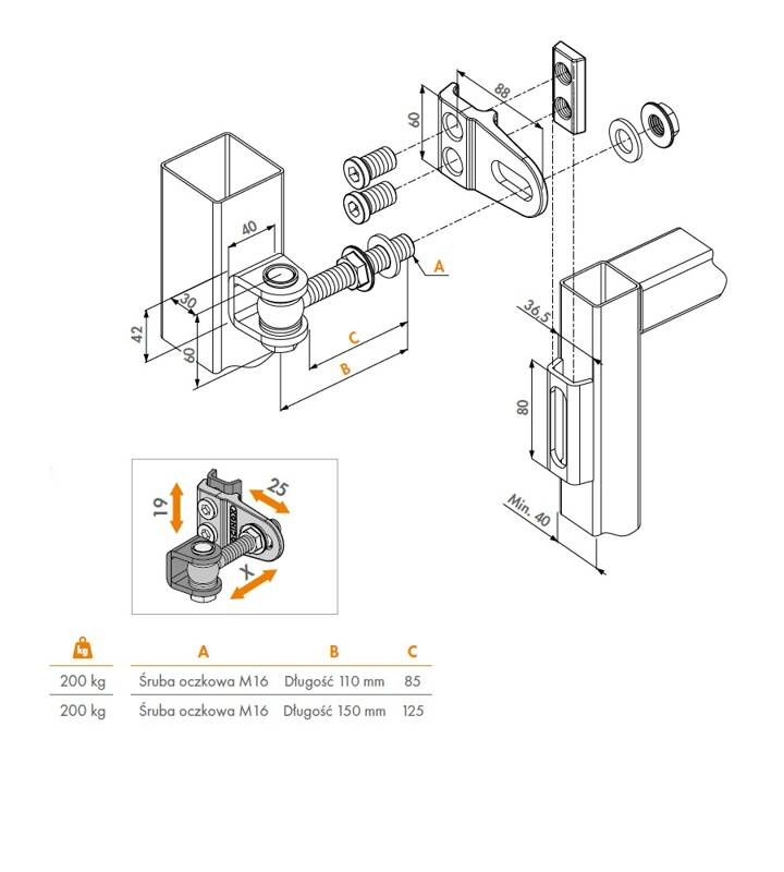 Ten zawias charakteryzuje się solidną konstrukcją oraz wysoką jakością wykonania. Elementy takie jak śruba zawiasowa i łapa zawiasowa są ocynkowane ogniowo, co gwarantuje odporność na warunki atmosferyczne i długotrwałą trwałość. Testowany przez 500 godzin w komorze z mgłą solną, ten zawias spełnia najwyższe standardy jakości i bezpieczeństwa.