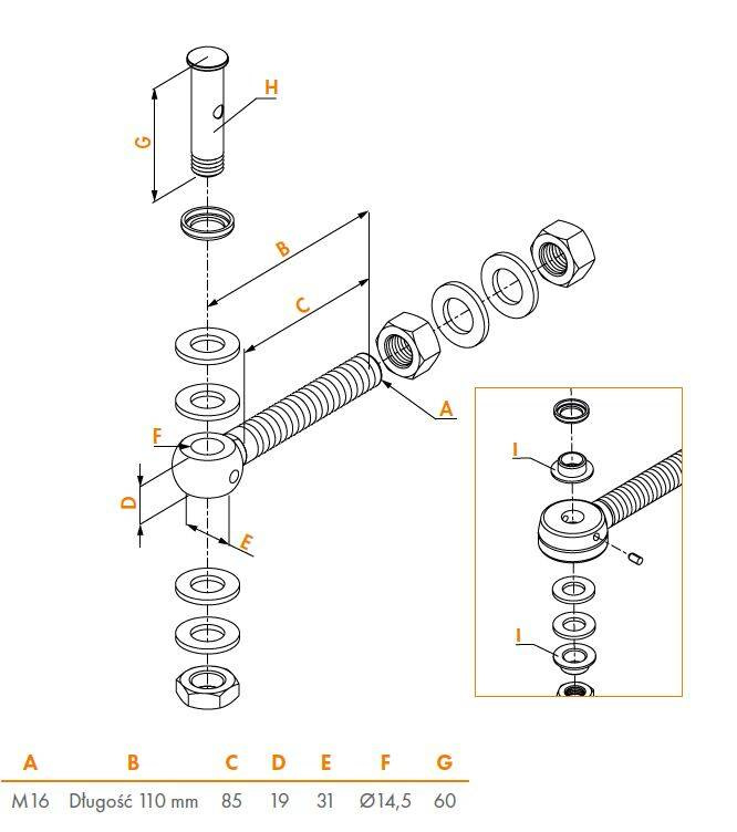 • Śruba oczkowa M16 z stali nierdzewnej zawiera: śrubę oczkową, oś poprzeczną, nakrętki i podkładki