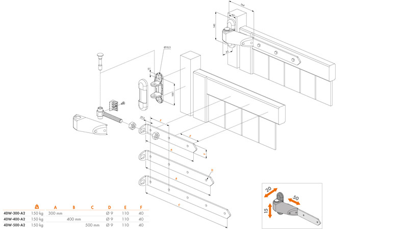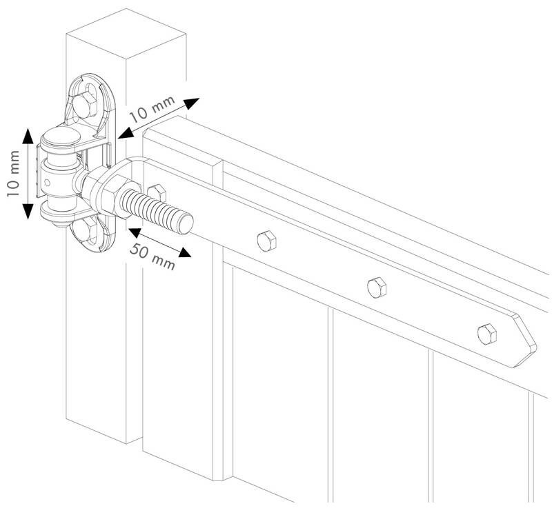 Zawias do furtek drewnianych z zabezpieczeniem antysabotażowym 180° Locinox 4DW zapewnia regulację odległości wzdłuż furtki w zakresie 50 mm, co pozwala dostosować furtkę do indywidualnych potrzeb.