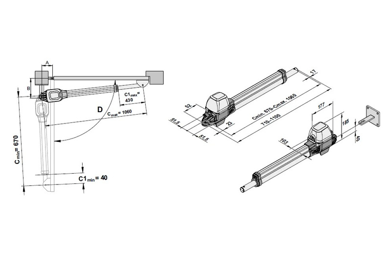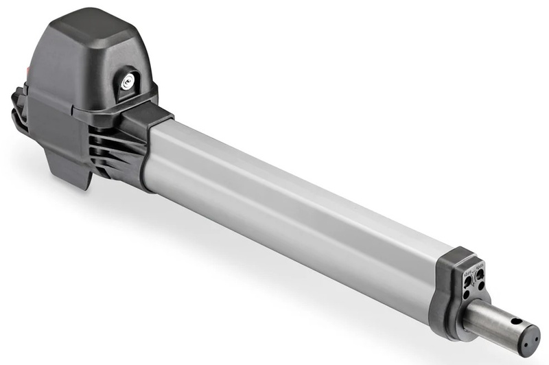 - Siłownik do bramy skrzydłowej z okuciami montażowymi na słupek i skrzydło.