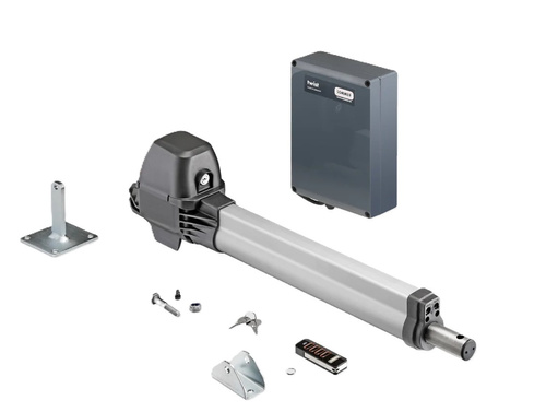 Komplet zawiera wszystko, czego potrzeba, by uruchomić automatykę do pojedynczego skrzydła: siłownik z okuciami na słupek i skrzydło, centralę sterującą w obudowie oraz radioodbiornik i pilot. Dzięki temu nie musisz kompletować podzespołów osobno – oszczędzasz czas i minimalizujesz ryzyko doboru niekompatybilnych elementów.